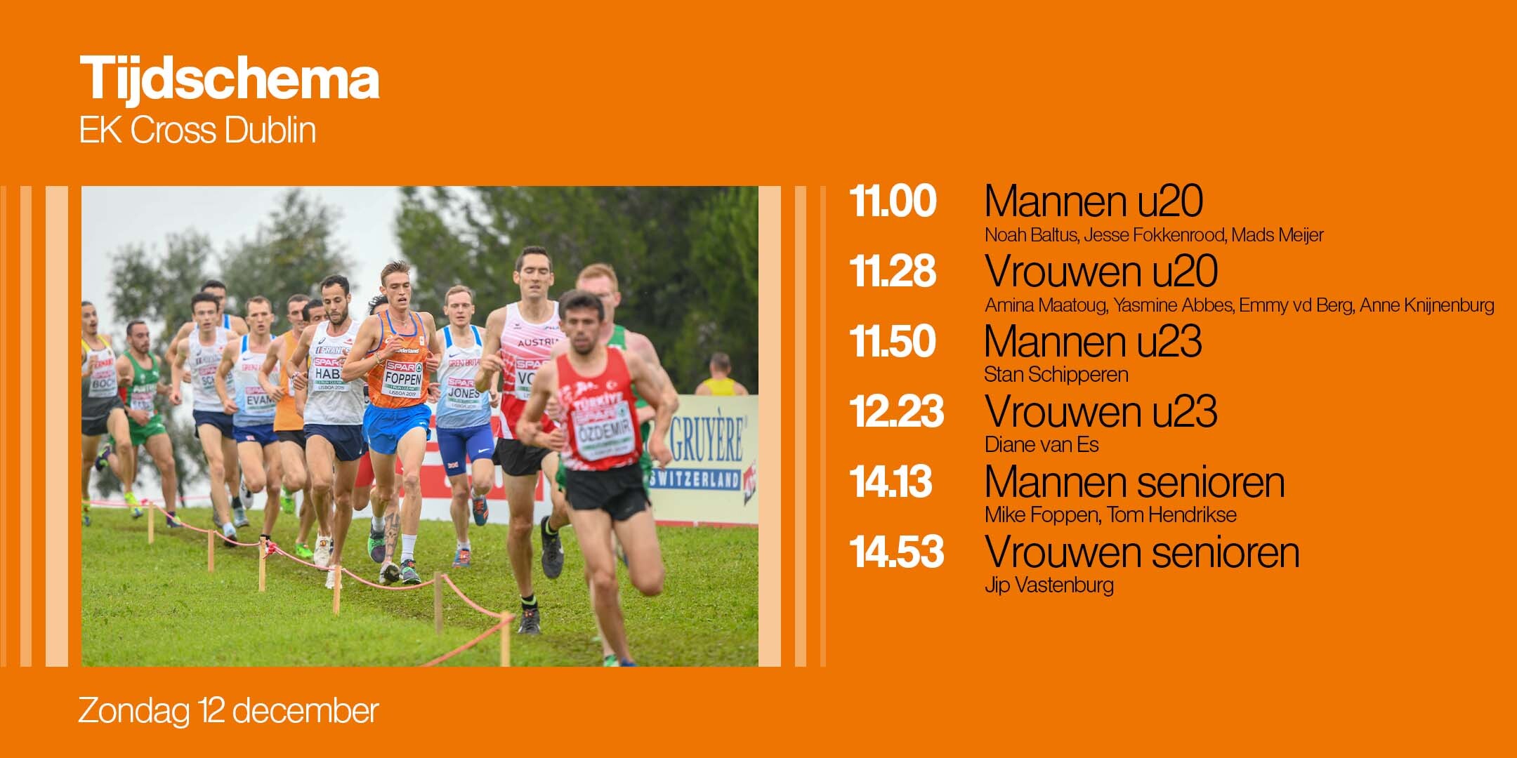 De mannen u20 bijten zondag om 11.00 uur Nederlandse tijd het spits af. Noah Baltus, Jesse Fokkenrood en Mads Meijer gaan niet alleen voor een individueel resultaat, maar doen ook mee in de strijd om het teamklassement. Van elk land worden de klasseringen van de beste drie finishers opgeteld. De totaalscore van deze drie lopers samen bepaalt welk land er vandoor gaat met de Europese titel in het teamklassement. Ook Teun ter Haar had zich gekwalificeerd voor deelname bij de mannen u20. Helaas kon hij op het laatste moment toch niet afreizen naar Dublin. TeamNL heeft ook bij de vrouwen u20 een team aan de start. In de overige categorieën zullen de Nederlandse atleten alleen individueel in actie komen. Hieronder zie je het volledige tijdschema van de Nederlandse atleten.