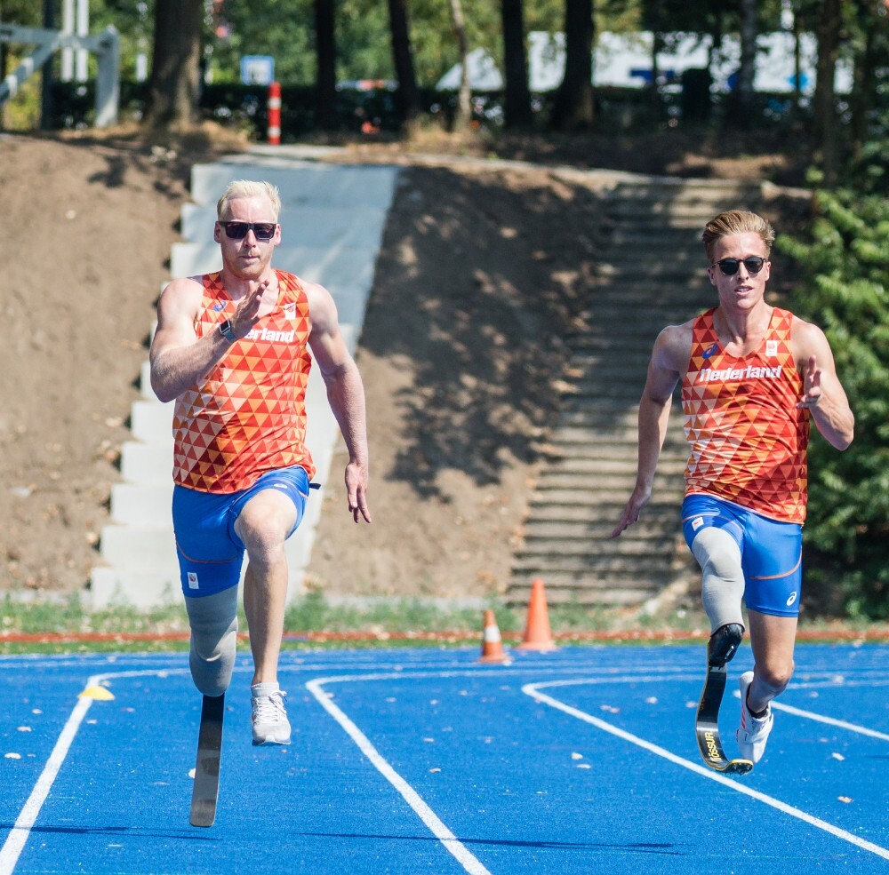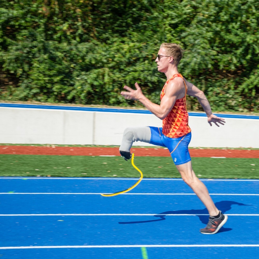 Levi (22): ‘Ik startte op mijn 18e bij Eindhoven Atletiek na mijn revalidatie. Daar leerde ik de basics van het lopen op blades. Na ongeveer een jaar sloot ik aan bij het talententeam van Papendal, en ging ik bij een sprintploeg van Nijmegen Atletiek trainen. Tijdens het afronden van mijn studie marketing & communicatie aan het Johan Cruyff in Nijmegen, maakte ik de overstap naar het fulltime Papendal-programma. Nu ben ik een volledige beroepsatleet.’