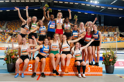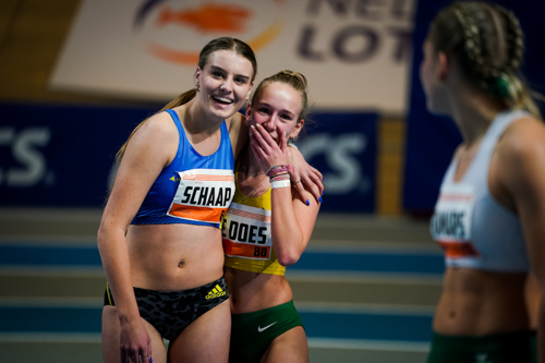 Joanne Schaap en Denise de Does waren zichtbaar tevreden met het resultaat op de 60 meter horden als begin van de meerkamp (u20). Joanne nam na vijf onderdelen de bronzen medaille naar huis. Denise finishte de meerkamp als vijfde.
