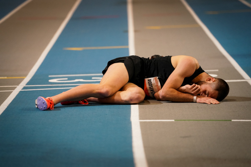 De laatste meters van de afsluitende 1000 meter moesten uit zijn tenen komen, maar Daan Roosenschoon bereikte de finishlijn (net). Het leverde hem een zilveren meerkampmedaille op bij de mannen onder 20.