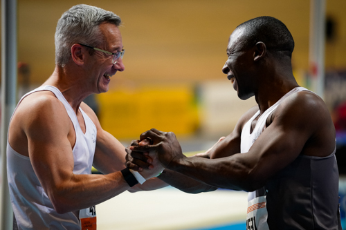 Samora Strijder (rechts) pakte de Nederlandse titel op de 60 meter in de categorie masters M45. Zijn teamgenoot van atletiekverenig U-Track, Joris van Zoelen (links), dacht dat aanvankelijk dat hij vierde was geworden. Tot het moment dat Samora hem erop wees dat het brons toch echt voor hem was.