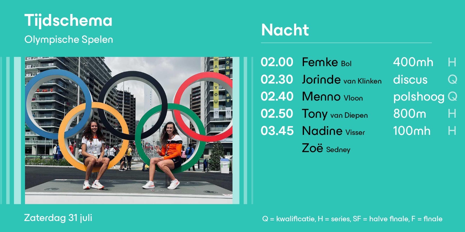 Vannacht (vrijdag op zaterdag) wordt het atletiekprogramma van TeamNL hervat. Hieronder zie je het Nederlandse tijdschema. Klik hier voor meer informatie over TeamNL op de Olympische Spelen.