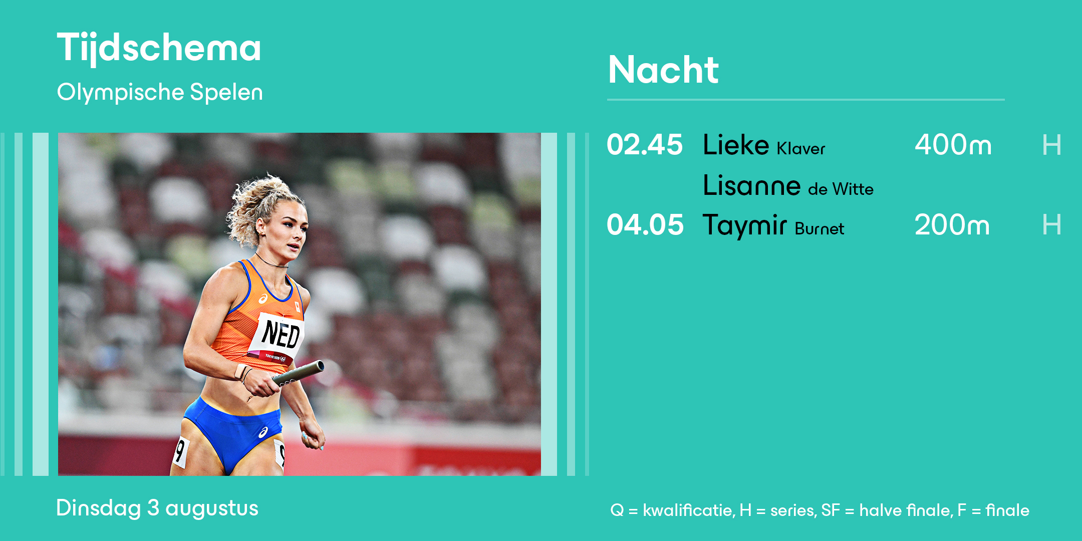 Heel veel tijd om bij te komen is er niet, want vannacht om 2:45 uur (Nederlandse tijd) staan 400m-loopsters Lieke Klaver en Lisanne de Witte alweer op de baan in Tokio. Hieronder het complete tijdschema. Klik hier voor meer informatie over TeamNL op de Olympische Spelen.
