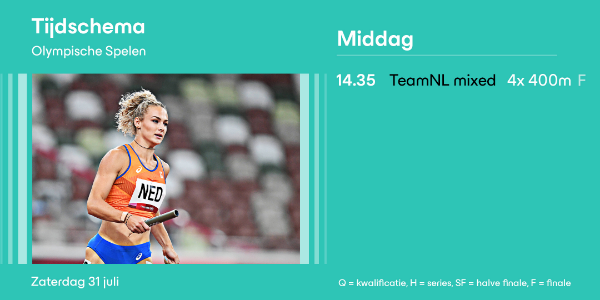 Vanmiddag staat de eerste atletiekfinale op de planning. Hieronder het Nederlandse tijdschema. Klik hier voor meer informatie over TeamNL op de Olympische Spelen.