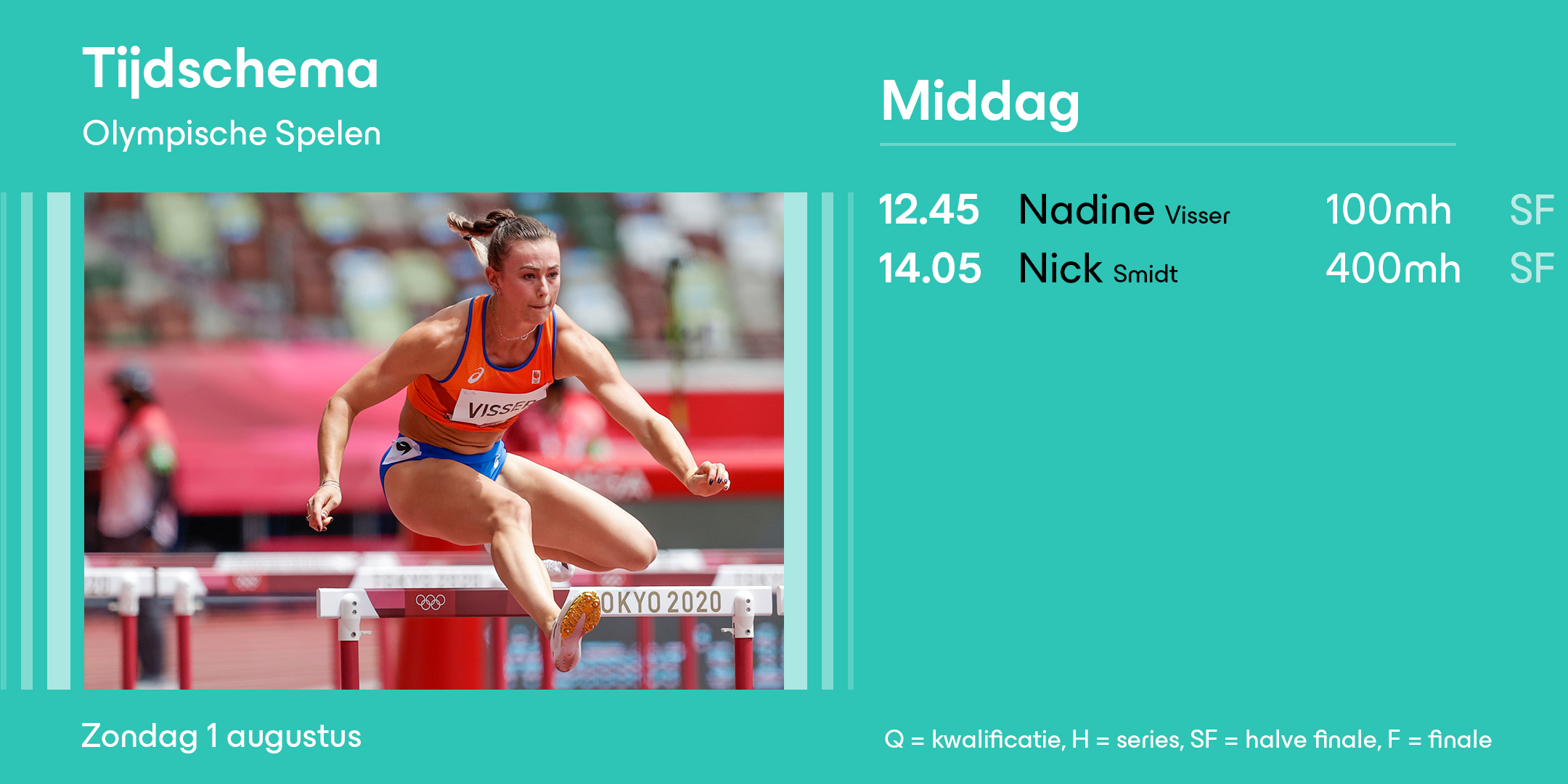 Vanmiddag om 12:45 uur Nederlandse tijd wordt het atletiekprogramma hervat met de halve finales van de 100 meter horden. Voor Nederland in actie: Nadine Visser. Ruim een uur later staat ook Nick Smidt zijn halve finale op het programma. Hieronder zie je het Nederlandse tijdschema. Klik hier voor meer informatie over TeamNL op de Olympische Spelen.