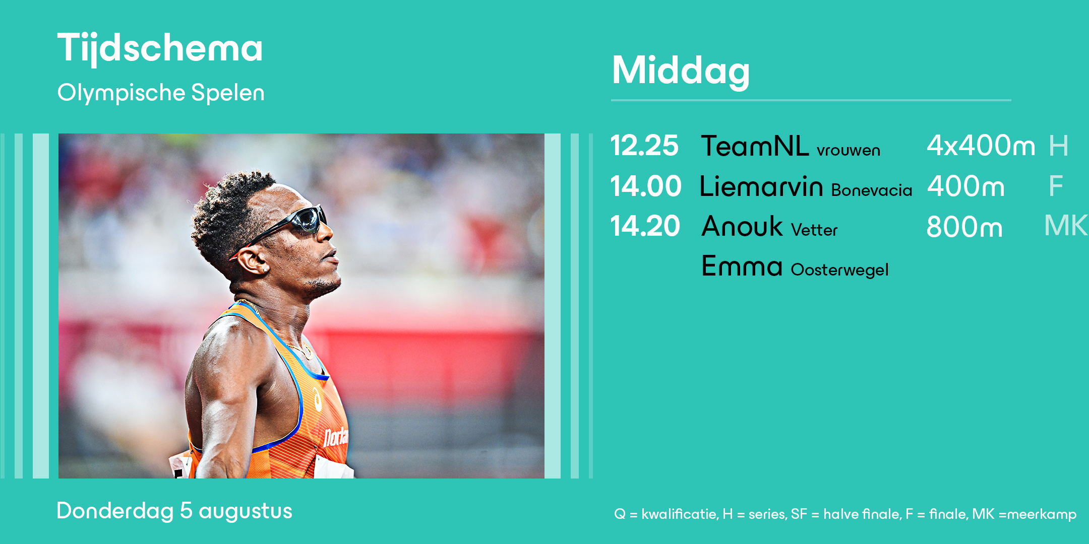 Vrijdag 30 juli tot en met zondag 8 augustus wordt het olympische atletiekprogramma afgewerkt in Tokio. In totaal komen 43 teamNL atleten in actie. Vannacht zagen we hoe meerkampsters Vetter en Oosterwegel aan dag twee begonnen, Nadine Broersen moest de strijd helaas staken. De 4x100m estafettedames bereiken de finale, de 4x100m mannen slagen hier niet in.