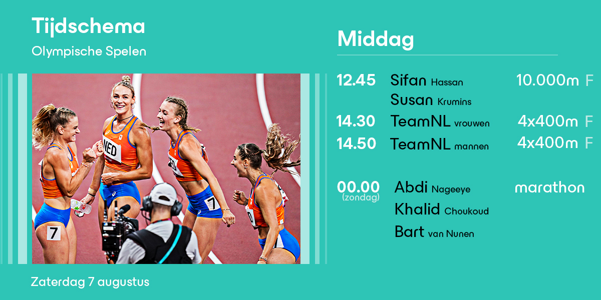 Zaterdagmiddag gaat Sifan Hassan op jacht naar haar derde medaille van deze Olympische Spelen. De 4x400m estafetteteams proberen hun goede resultaten uit de series een vervolg te geven in de finale. In de nacht van zaterdag op zondag lopen de mannen hun olympische marathon.