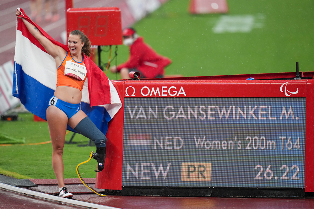 Nadat Marlène van Gansewinkel en Kimberly Alkemade zich eerder vandaag wisten te plaatsen voor de finale van de 200 meter in de klasse T64, mochten ze vanmiddag meestrijden om de medailles. In een regenachtig Tokio snelde Marlène van Gansewinkel in een nieuw paralympisch record van 26.22 seconden naar het goud. "Ik ben nog nooit zo klaar geweest voor een 200 meter. Ik wist dat ik een kans had dus ik ging ervoor. Ik haalde mijn Duitse concurrente in de bocht in. Ik wist dat ik door moest gaan en ik heb hem gewoon!" Voor Van Gansewinkel is dit haar tweede medaille deze Paralympische Spelen. Ze won ook al brons bij het verspringen.