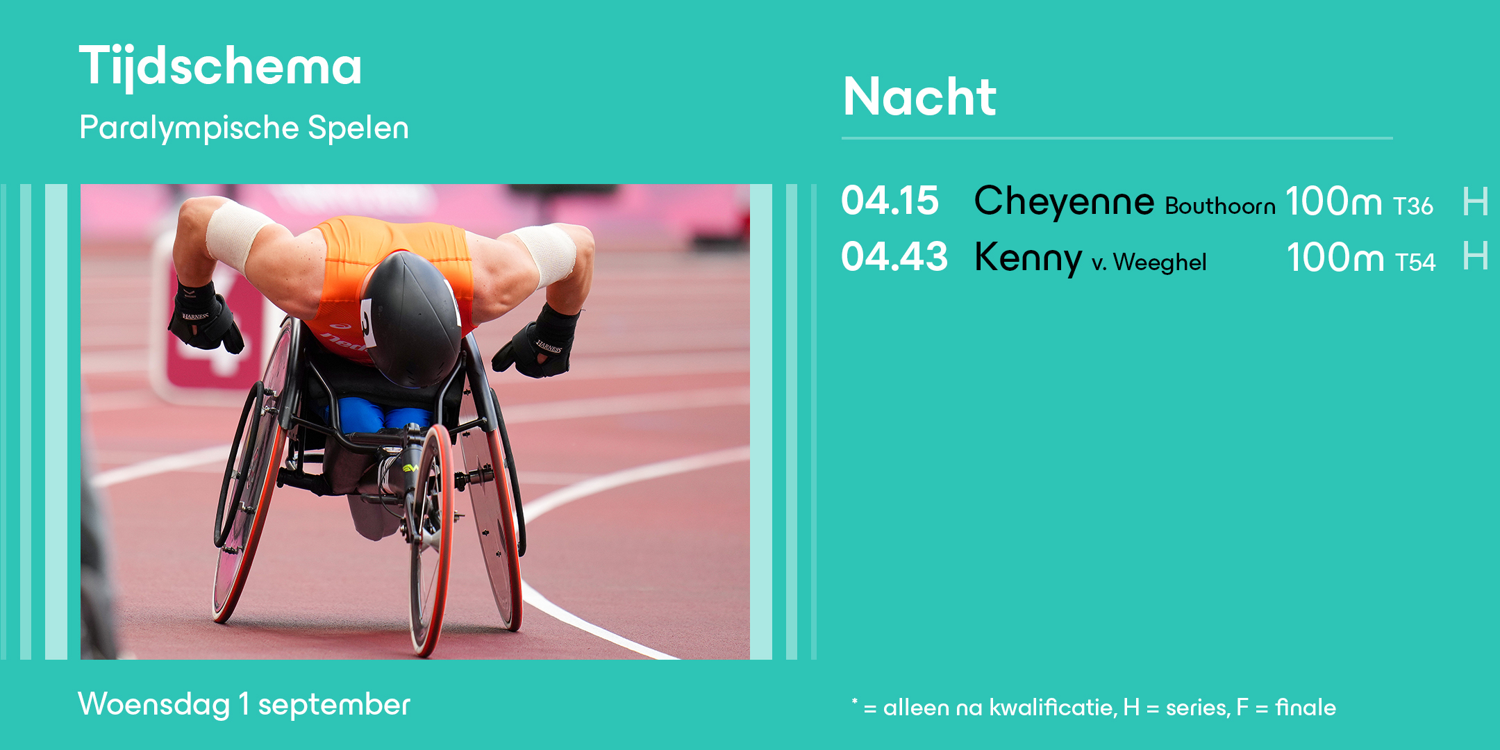 Komende nacht komen twee Nederlandse atleten in actie. Hieronder zie je het tijdschema. Klik hier voor meer informatie over TeamNL op de Paralympische Spelen.