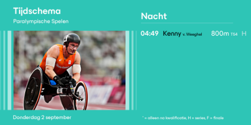 Ook Kenny van Weeghel moet zich 's ochtends plaatsen voor de finale later vandaag. Hij plaatst zich niet rechtstreeks, maar zijn tijd is snel genoeg om een plekje in de eindstrijd te bemachtigen. In de finale start Kenny van Weeghel als een speer, maar hij weet die voorsprong niet te behouden of uit te breiden. Zijn concurrenten rijden langzaam bij hem weg, volgen lukt niet. Uiteindelijk eindigt van Weeghel als achtste in de 100 meter T54 finale. Een domper. Hij kan niet lang in de teleurstelling blijven hangen, want vannacht (ochtend in Tokio) staan de 800 meter T54 series alweer op het programma.