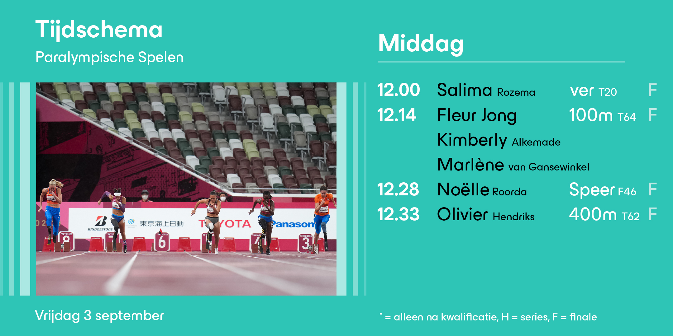 Van vrijdag 27 augustus tot en met zondag 5 september wordt het paralympisch atletiekprogramma afgewerkt in Japan. In totaal komen 17 teamNL atleten in actie. Op donderdag 2 september 2021 kwalificeerde het Nederlandse trio op de 100 meter zich voor de finale en vloog Fleur Schouten naar de zevende plaats bij het verspringen.