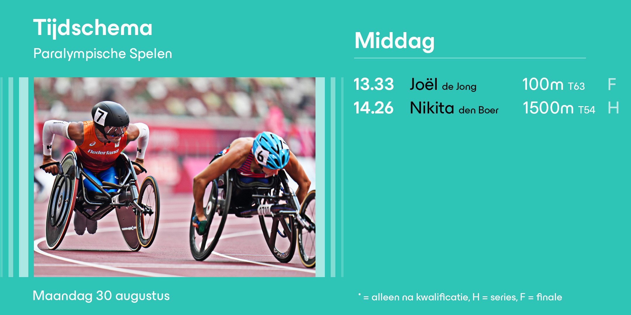 Joël de Jong debuteerde gisteren al op het verspringen waar hij als zesde eindigt. Vandaag zien we hem terug op de 100 meter (T63). Om 21:47 uur (Tokio tijd) start hij in de tweede serie. Joel de Jong finisht in deze snelle serie als vierde in 13.00 seconden. Hiermee weet hij als tijdsnelste een plek te bemachtigen in de finale! We zien Joël morgen, maandag 30 augustus, om 20:33 uur (Tokio tijd) terug in de finale over 100 meter.