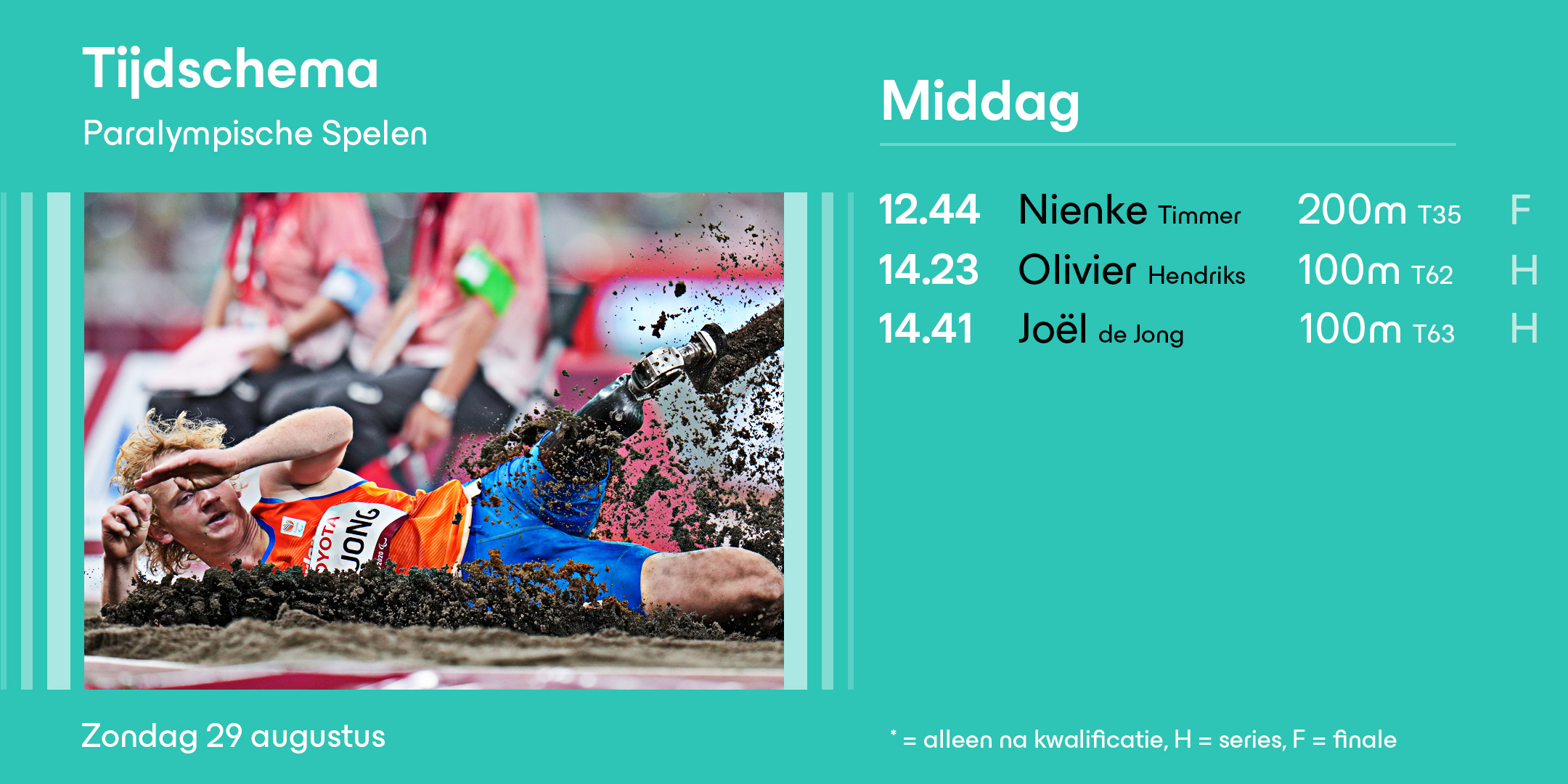 Kenny van Weeghel, de paralympisch kampioen van 2016 over 400 meter, start in de derde serie over 400 meter. De eerste drie kwalificeren zich rechtstreeks, aangevuld met de twee tijdsnelsten per serie. In een enorm snelle serie komt van Weeghel als derde over de finishlijn in een tijd van 46.81 seconden. De eerste serie was nóg sneller, waardoor van Weeghel zich uiteindelijk niet weet te plaatsen voor de finale. Voor de paralympisch kampioen eindigt zijn 400 meter in deze series. De finale wordt vanavond om 20:21 uur (Tokio tijd) gereden, zonder van Weeghel.