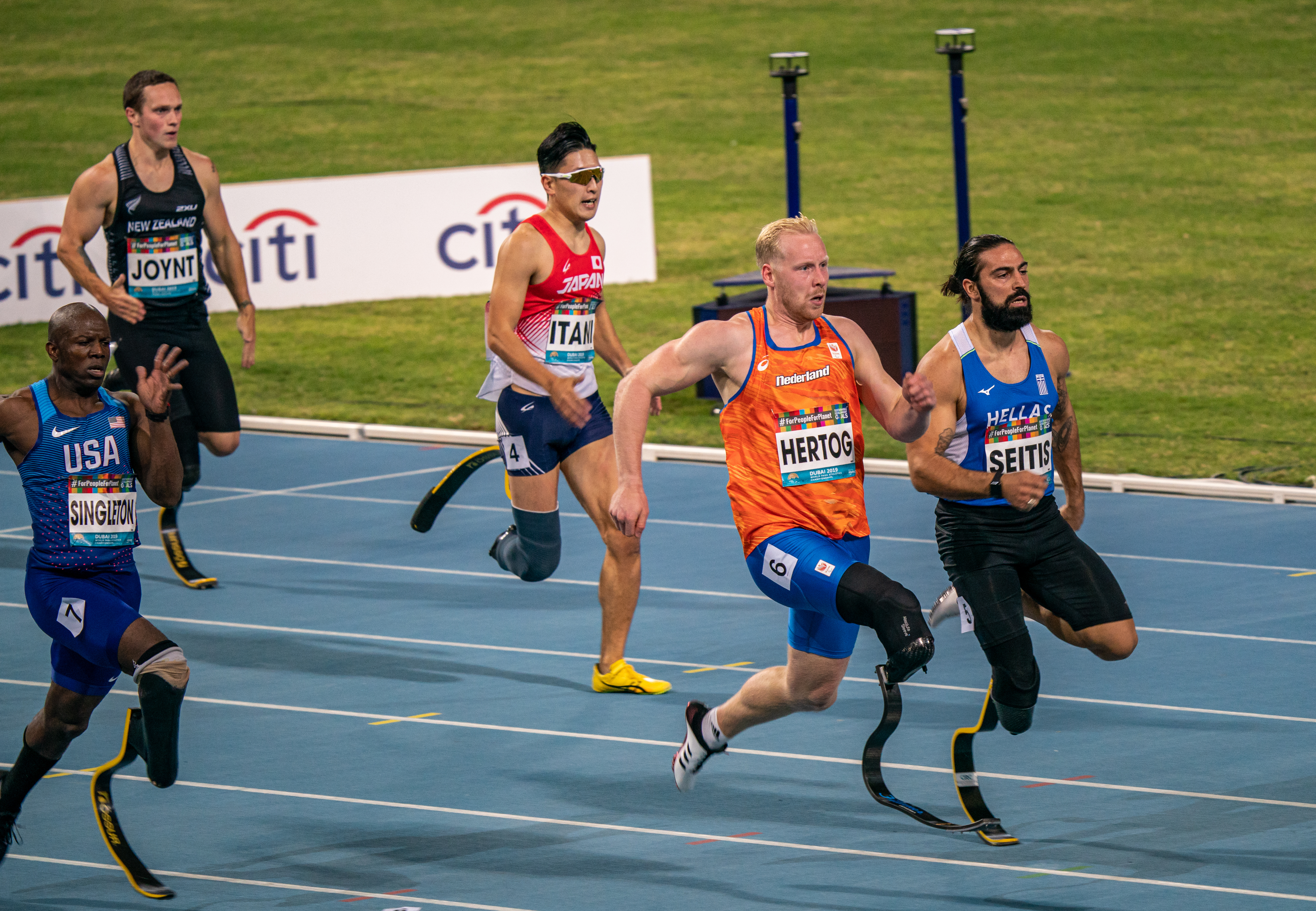 Dag twee in Dubai was er meteen een met de eerste finale voor Nederland. Kenny van Weeghel wist gisteren, als één van de twee tijdsnelste, knap de finale van de 100 meter te bereiken in een enorm sterk deelnemersveld. Waar hij in de halve finale nog een tijd van 14.27 sec noteerde, was hij vandaag in de finale niet opgewassen tegen zijn concurrenten. Kenny wordt uiteindelijk achtste. Zijn tijd: 14,62 sec. Het is wederom de Fin Leo Pekka Tahti die er in een razendsnelle 13.97 met de winst vandoor gaat. De Chinese Lio volgt kort daarop en de Mexicaan Cervantes pakt hier het brons.