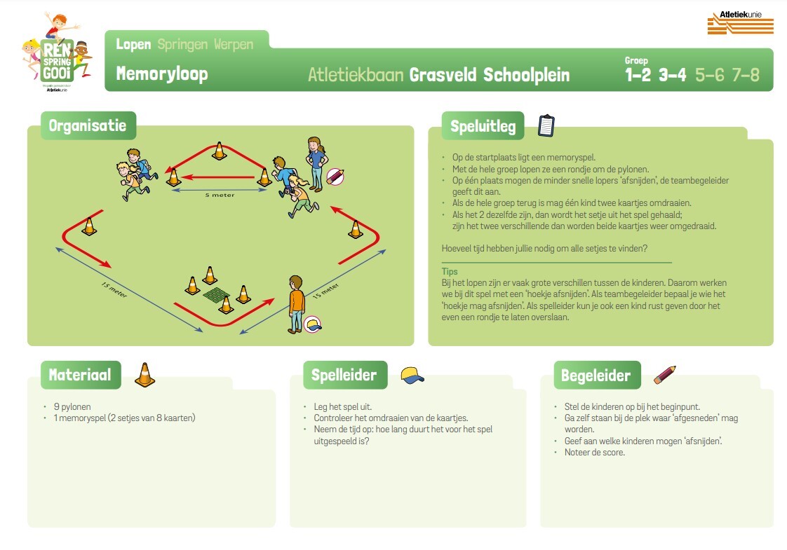 Met deze tool stel je jouw eigen atletiekdag samen op het schoolplein, op een grasveld of op een échte atletiekbaan. Het enige wat je vooraf bepaalt, is de duur van de activiteit, het aantal kinderen, de leeftijdsgroepen én de plek waar je deze dag wilt organiseren. Vraag de Ren.Spring.Gooi Atletiektoernooi-tool aan en ontvang deze in jouw mailbox. Elk onderdeel staat duidelijk uitgeschreven op een instructiekaart. Voor elke discipline zijn meerdere spellen uitgewerkt, zo giet je elk atletiektoernooi weer nét even in een ander jasje.